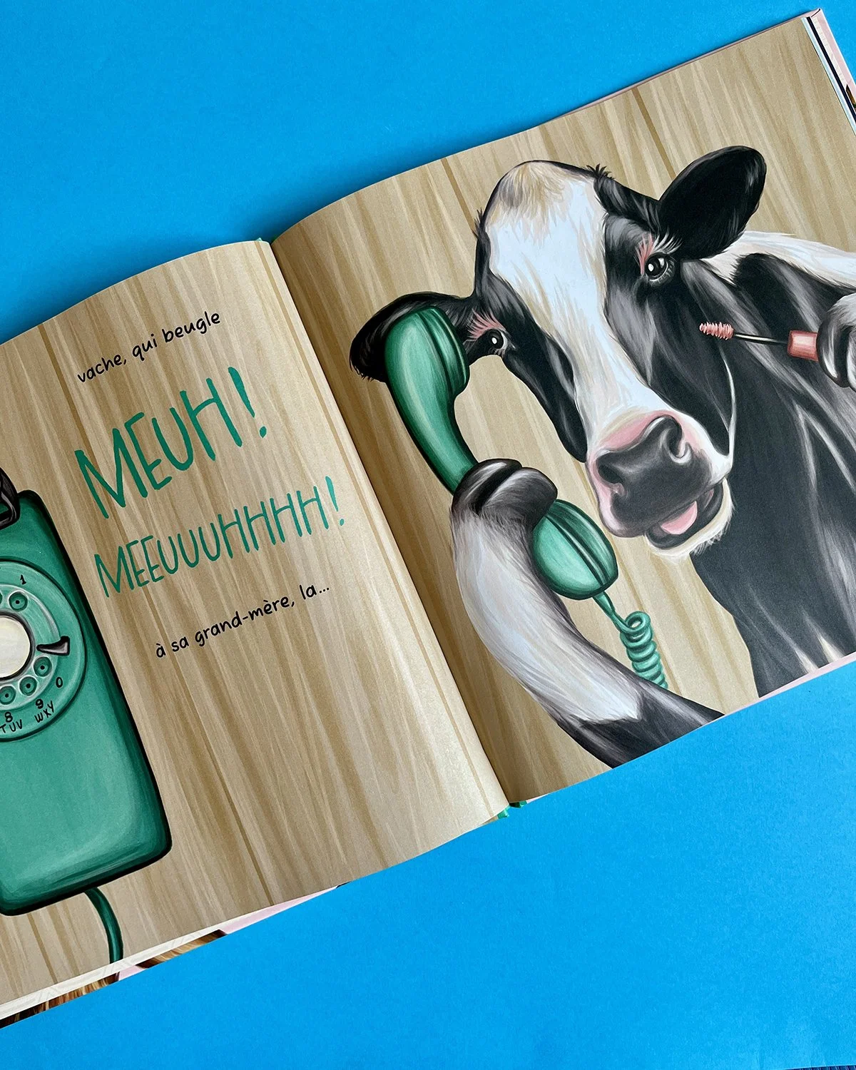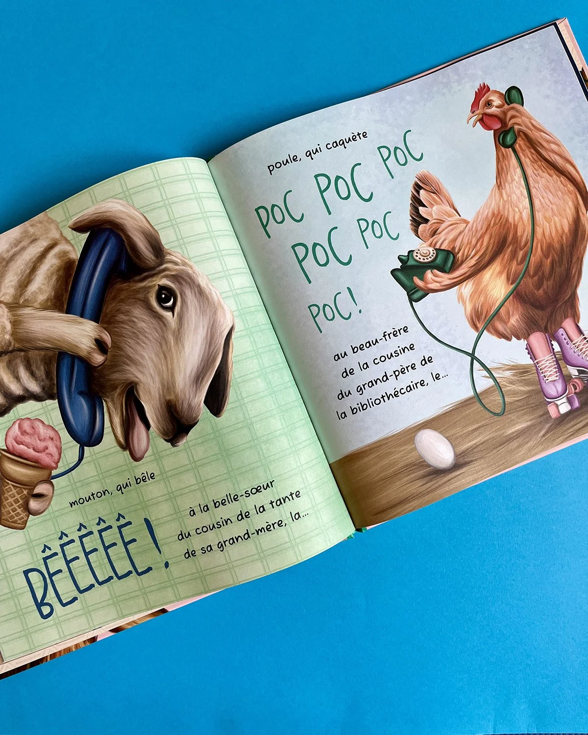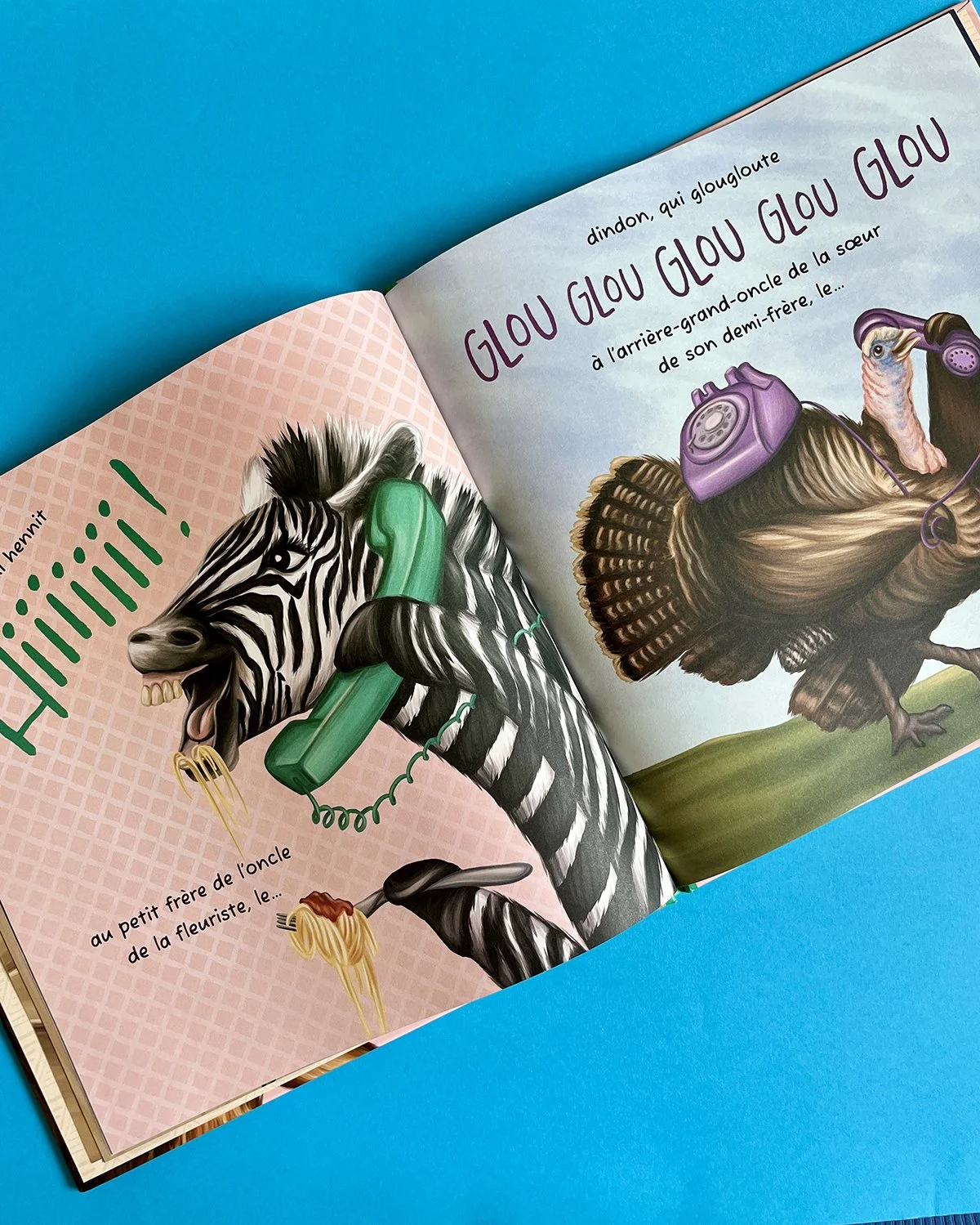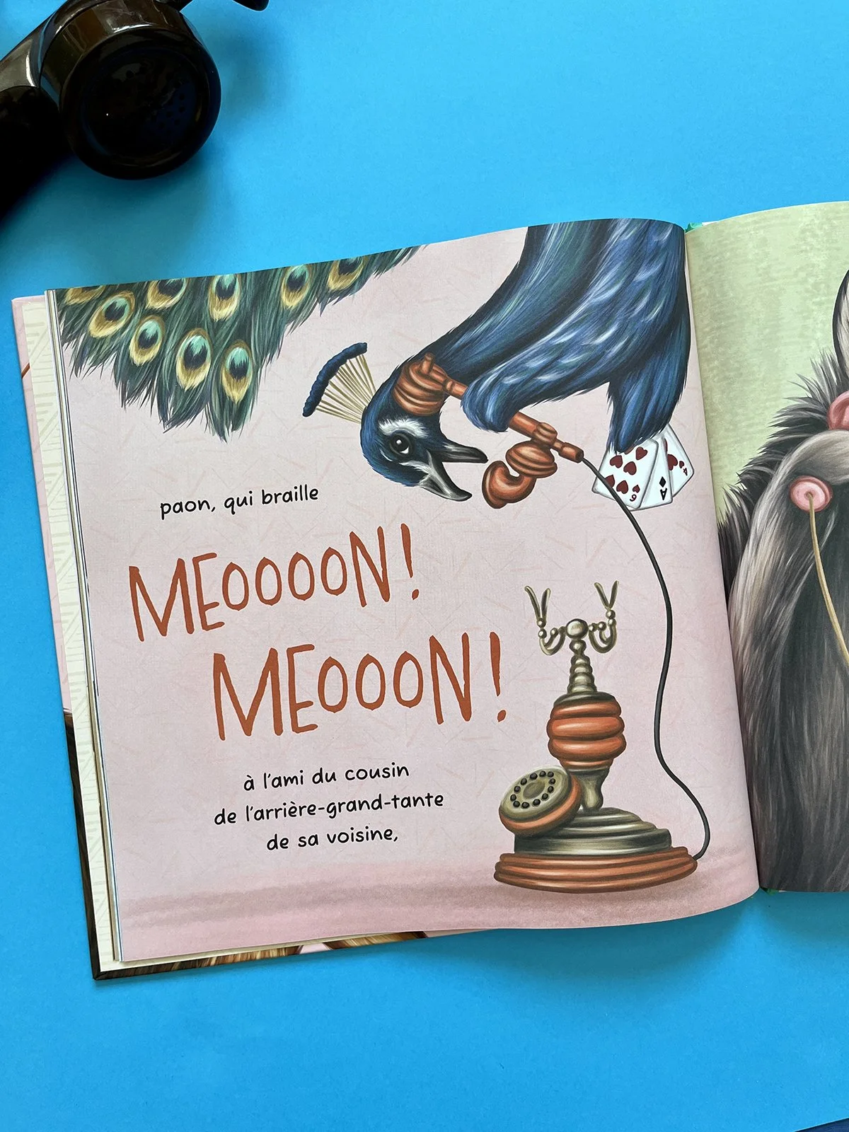 🎨 Comme toujours, j’ai pris un grand plaisir à illustrer chaque animal en pleine action : l’un mange ses rôties en glapissant, un autre s’applique du mascara en beuglant, un troisième se brosse les cheveux en cancanant! En fait, j’ai imaginé ce que l’animal était entrain de faire avant de répondre au téléphone. J’ai aussi travaillé les portraits et les gros plans pour qu’on voit bien la variété de téléphone rétro. J’ai une affection particulière pour ces beaux objets que nous n’avons plus dans nos maisons et qui étaient presque décoratifs à une certaine époque.