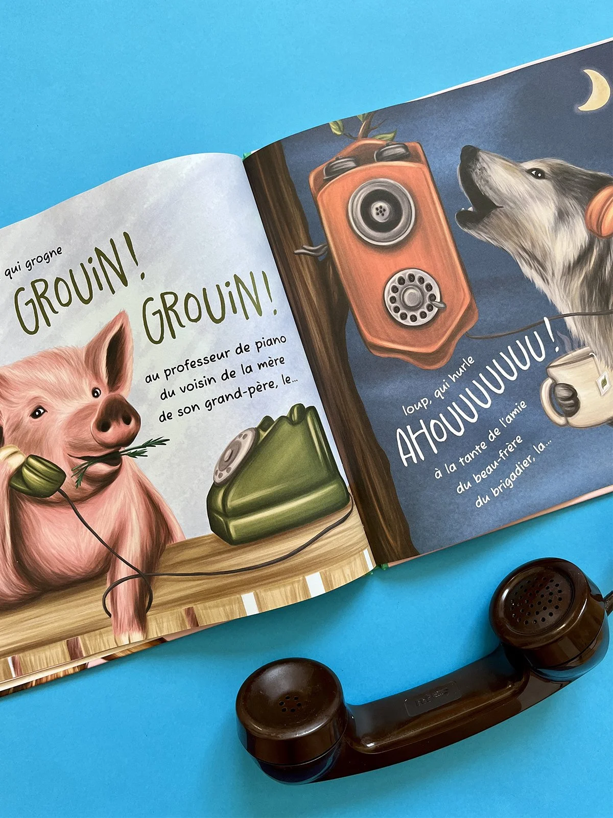 Ce livre permet aux tout-petits de découvrir les cris des animaux tout en enrichissant leur vocabulaire. On y apprend qui glapit, qui brame, qui cancane, qui beugle… mais surtout, on s’amuse à imaginer ce que tous ces animaux peuvent bien se raconter au téléphone ! J’espère aussi piquer la curiosité des enfants et qu’ils s’intéresseront à l’évolution du téléphone.